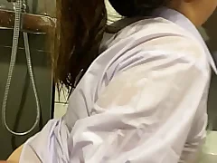 She comes into the bathroom and puts my cock between her tits, full video on my Red Page.